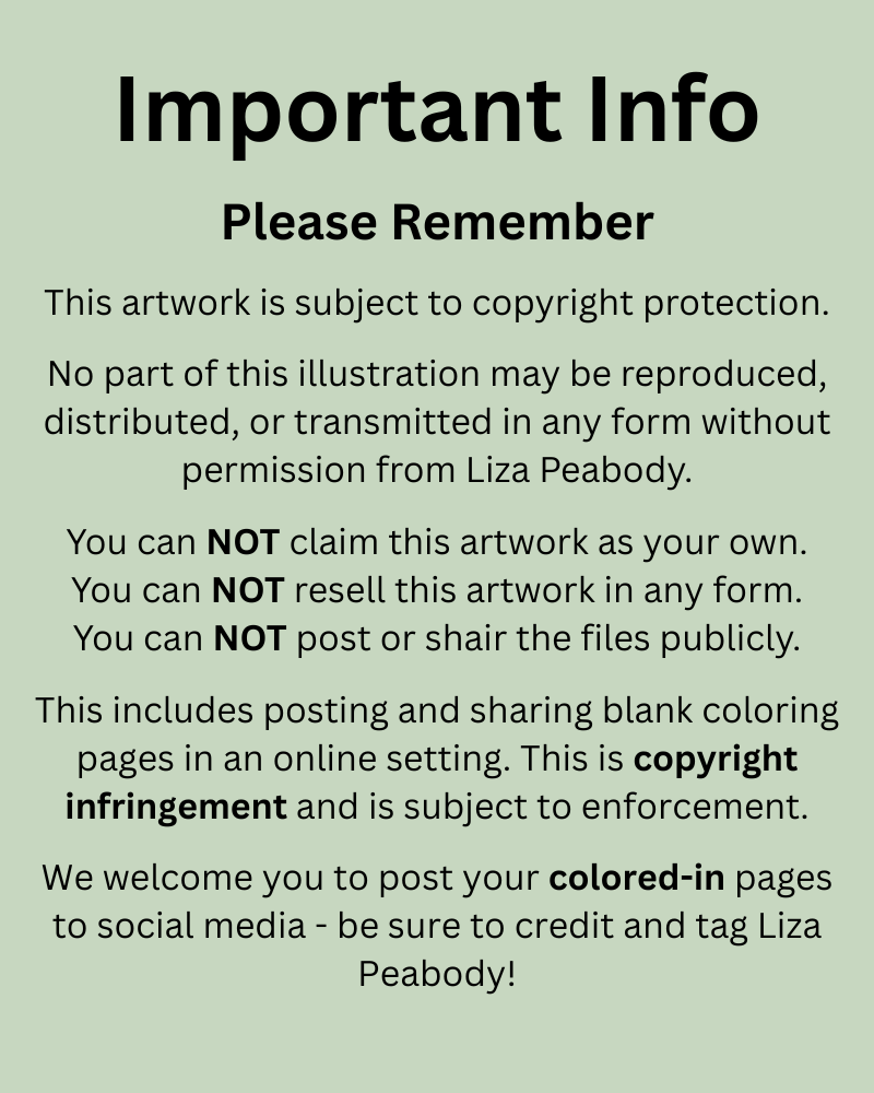 - PLEASE READ COPYRIGHT INFORMATION! You can NOT resell or repost coloring pages. Be sure to credit and tag Liza Peabody if you post your coloring to any social media site. *you may only post colored-in pages.